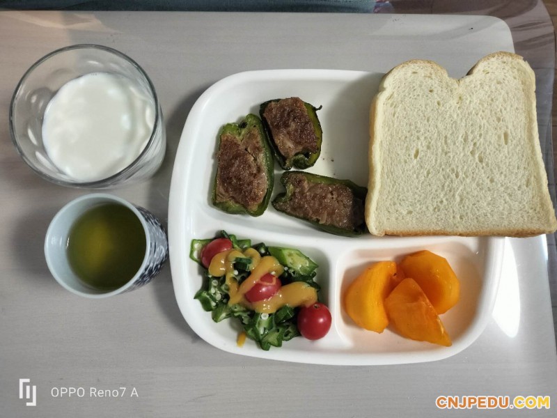 (面包,青椒肉馅,秋葵和小番茄醋拌,水果,牛奶,咖啡)