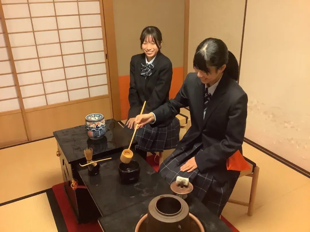 茶道部通过点茶的练习加深同学们对日本文化的理解。还会定期召开茶会,招待校外来客和学校内的老师和同学们。茶道部的成员们在“好文明华祭”时会身着和服进行专业茶道表演。