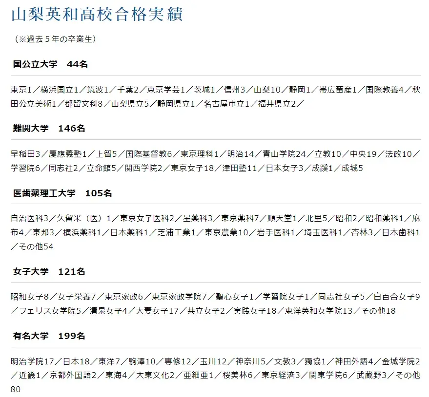 日本的“基督教学校教育同盟”之间设有更便捷的升学渠道,互相关照。山梨英和高中和青山学院大学均是“基督教学校教育同盟”之一,相互之间也有着深度的交流和合作。此外,在山梨英和高中就读的学生们报考同是“基督教学校教育同盟”的青山学院大学、明治大学、立教大学等日本一流大学时,可以享受更多报考政策。在偏差值53的学校考入偏差值70以上的大学,这相当于我们在中国的普通高中,考入了985大学!