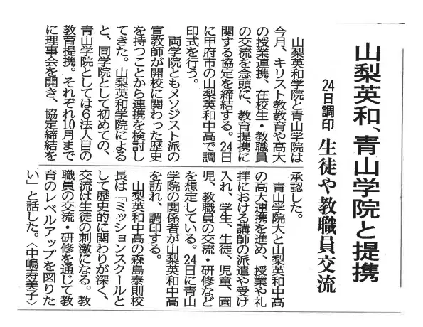青山学院和山梨英和学院以进一步充实和发展两校共同使命的基督教教育,以及加强中等教育和高等教育的合作为目的,签订了教育合作协定。根据本协定,山梨英和高中与青山学院大学将推进以下教育合作: