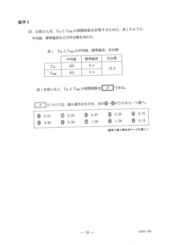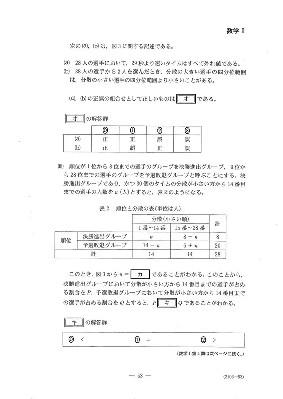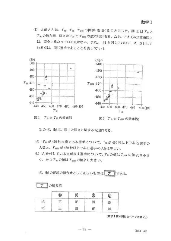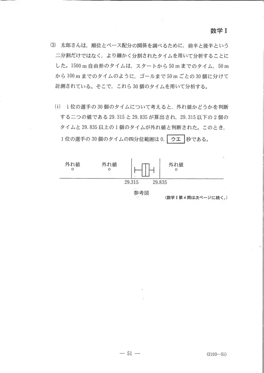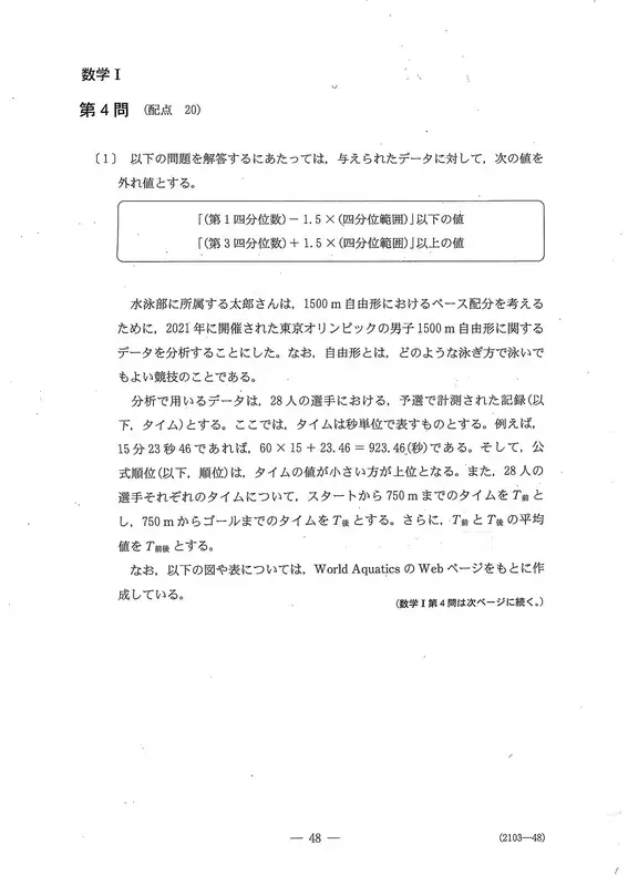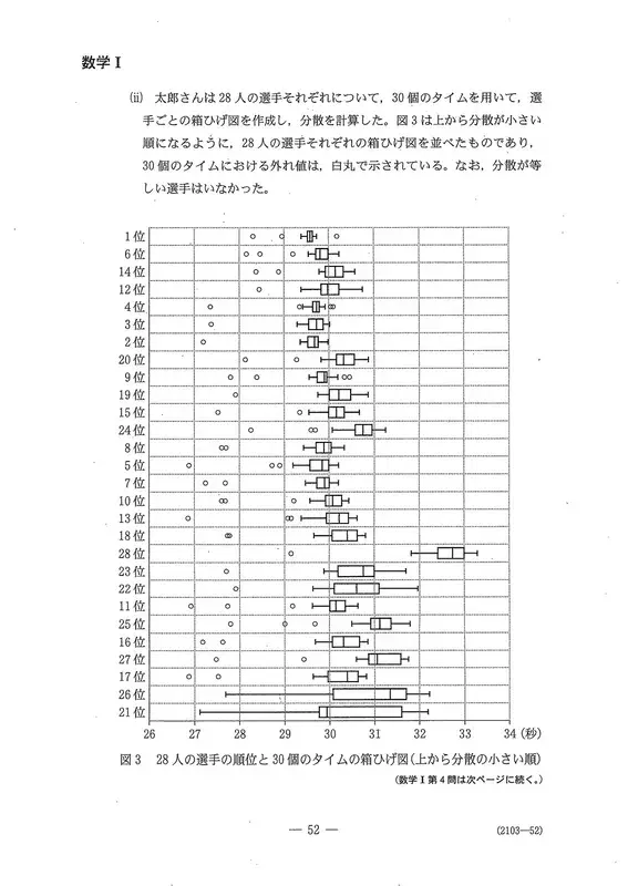 〔1〕是关于东京奥运会男子1500米自由泳预赛成绩的问题。(1)需要比较多个散点图,并具有逻辑解读能力。(2)是根据标准差和协方差计算相关系数的问题。(3) (i)中,从作为离群值判定基准的数值逆推四分位范围的问题令人耳目一新。第(ii)题考察了箱胡子图与方差的关系性,关键在于是否正确认识分布形状和方差尺度的差异。另外,没有出现关于假设检验思维方式的考题。