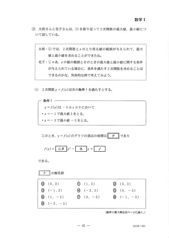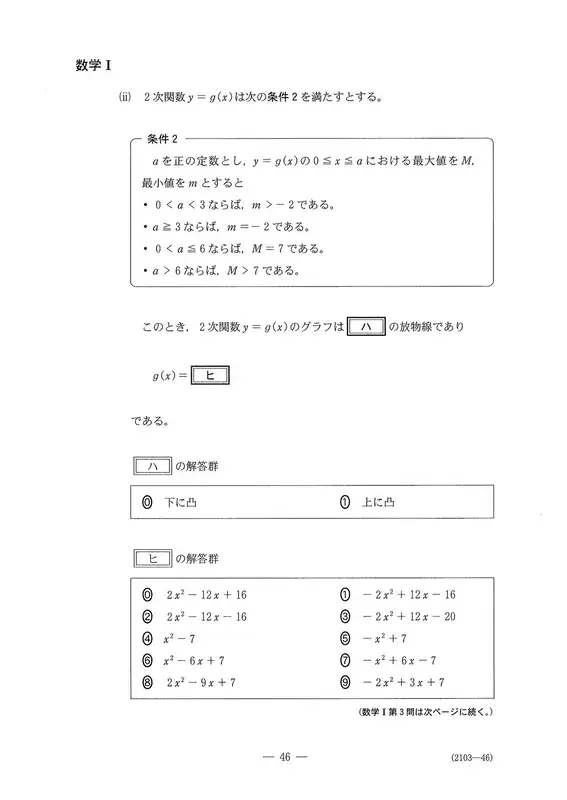 〔2〕是以对话形式从二次函数的最大值和最小值来考察图表的问题。根据给定条件判断是上凸图表还是下凸图表,这一点很新颖。