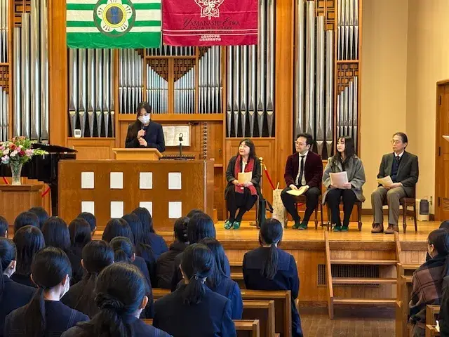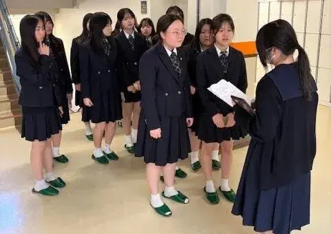 抵达山梨英和高中第一天,24名来自韩国的女孩子们先参观了学校,并举行了基督教联合礼拜以及欢迎会。欢会上,两校校长分别致辞。在随后的茶话会上,两校学生们积极交流。